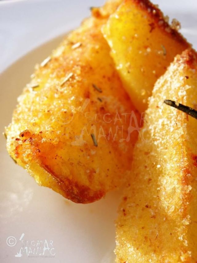 Cartofii se curata si se spala bine. Se taie in bucati mari sau se lasa intregi sau jumatati daca sunt mici. Se aseaza intr-o tava, pe hartie de copt. Se stropesc cu ulei de masline. Se condimenteaza cu sare si piper. Se presara cu rozmarin proaspat si/sau uscat (preferabil mai mult proaspat). Se pudreaza cu foarte putina boia dulce, asa, mai mult pentru aspect. Deasupra se presara pesmet. Se dau la cuptor, la foc mic aproximativ 45 de minute, pana se coc in interior si devin aurii si crocanti la suprafata. Pot fi serviti simpli, cu parmezan sau cascaval ras deasupra sau ca si garnitura la un fel prinicpal. Sunt foarte aromati si gustosi.