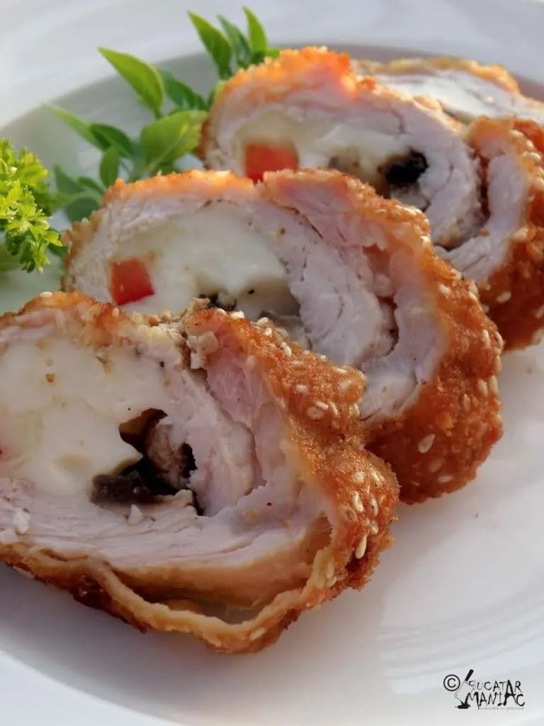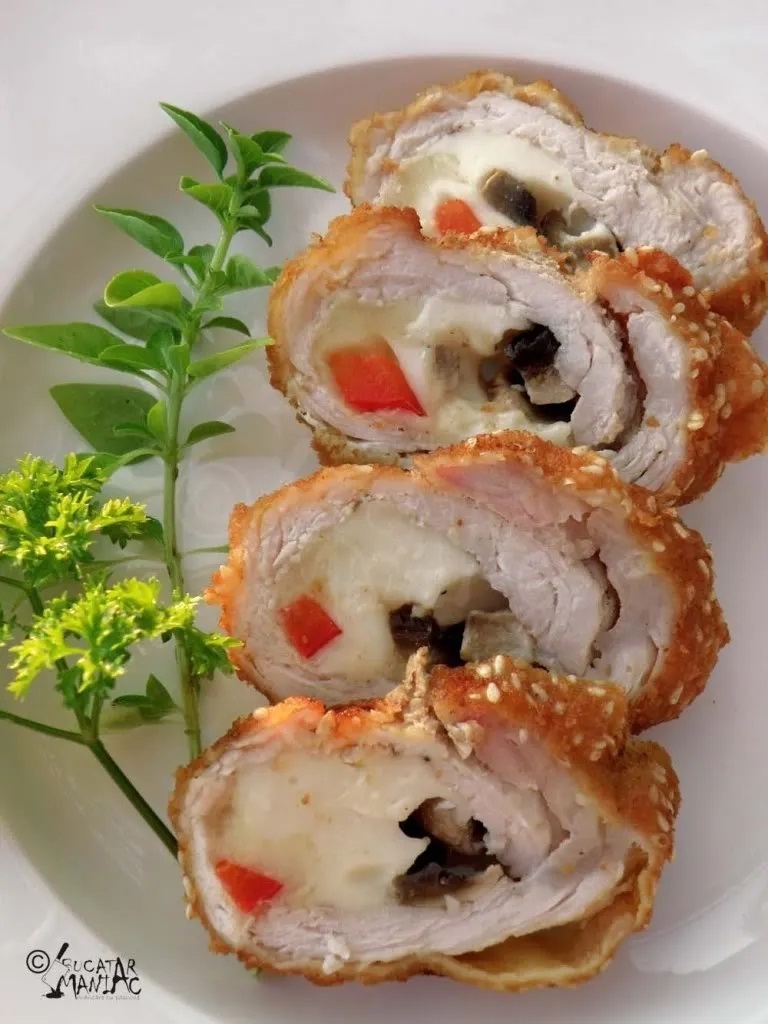Felia de cotlet se acopera cu o folie de plastic (ca sa nu se rupa) si se bate bine pana se intinde si devine subtire. Pe mijloc, se aranjeaza fasii de ardei gras, ciuperci si mozzarella. Se condimenteaza cu sare si piper dupa gust si se ruleaza. Se da prin faina, apoi prin oul batut si in final prin pesmetul amestecat cu seminte de susan. Se prajeste in ulei incins, pe toate partile, la foc mic, pana prinde o crusta aurie.