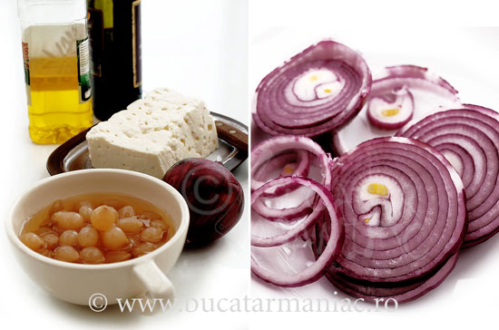 Ceapa rosie se taie rondele care se vor desprinde usor in inele aspectuase si gustoase. Branza se taie cubulete mici, egale. Cele doua ingrediente se amesteca usor. Ceapa murata (baby onion) se scurge de zeama si se adauga in salata. Se stropeste totul cu otet balsamic si ulei de floarea soarelui presat la rece. Apoi se asezoneaza cu sare si piper dupa gust. Se poate servi perfect alaturi de buruschete sau ca si garnitura langa mancaruri cu carne.