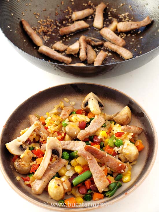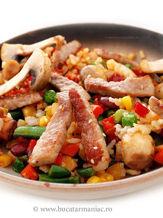 Vremea incepe sa fie frumoasa si nu mai e timp de stat in casa. Dar in timp ce planuim tot felul de gratareli cu prietenii, mai trebuie sa si mancam cate ceva. Asa ca am facut astazi o mancare rapida, la wok, cu legume, orez si carne de porc. Habar n-am ce natie are, poate ma lamuriti voi, ca eu nu prea le am cu asiaticele. Nu m-am documentat, dar am adaugat, intuitiv, niste condimente care mi s-au parut mie potrivite.