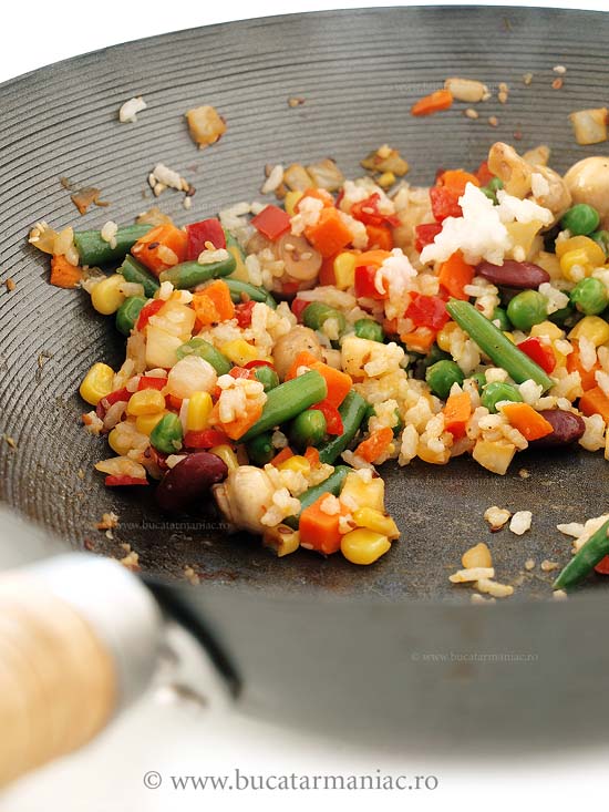 Am incins bine wok-ul pe foc mare. Am pus 3 linguri de ulei. Am adaugat o lingurita de seminte de susan. le-am lasat cateva secunde sa prinda culoare. Cand au inceput sa lase aroma specifica am aruncat inauntru legumele congelate si ciupercile. Am asezonat cu sare si piper. Le-am sotat cateva minute la foc mare (2-3 minute). Orezul fiert in prealabil, l-am adaugat orezul si am amestecat usor,. Am lasat totul deoparte ca sa se intrepatrunda aromele.