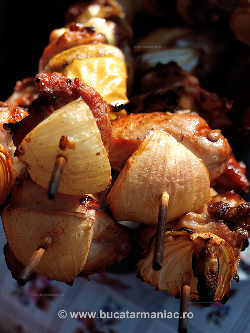 De fapt, am folosit bucati de carne care au ramas de la niste felii mai mari, pe care le-am pus pe gratar. Pana cand primele s-au facut, am pus bucatelele de pui in iaurt, cu putina sare si piper. Pe cele de porc le-am condimentat cu Don Marco`s Pig Wing. Merele le-am taiat cuburi, iar ceapa am taiat-o in sferturi. Le-am insirat pe frigarui. Unele doar cu carne de pui, altele doar cu carne de porc, iar altele, mixte, in fucntie de preferintele fiecaruia. (Nu uitati sa inmuiati cu cateva ore inainte betele pt frigarui- eu am uitat si le-am inmuiat pe loc, in bere :P)