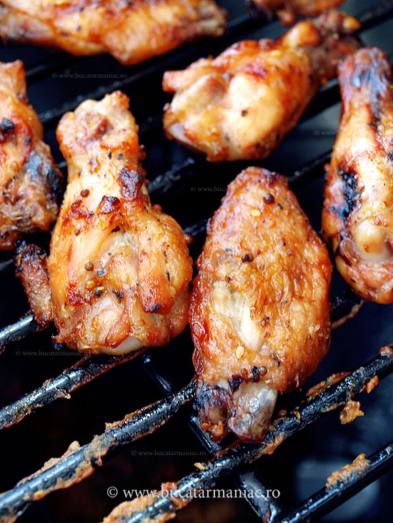 Am incins gratarul la 200-220 de grade C (vreo 15 minute). Am pus aripioarele direct pe gratar (fara a folosi plite, de asta data) si le-am gatit cate 10 minute pe fiecare parte, sa se rumeneasca bine. Au iesit asa cum le vedeti in fotografii, picante , lipicioase si aromate.