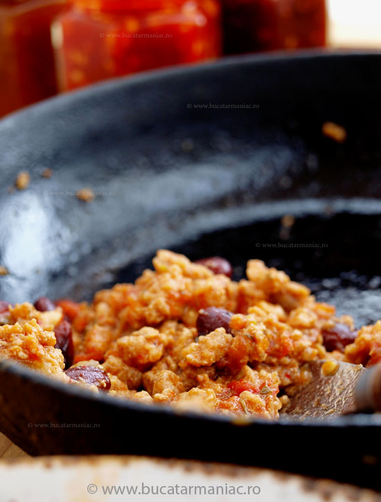 La final, inainte sa iau mancarea de pe foc am mai adaugat o rosie cubulete (pentru aspect) si fasolea din conserva (fara zeama). Chili con carne este o mancare foarte consistenta si robusta iar dulceata de ardei iute si-a facut treaba perfect.