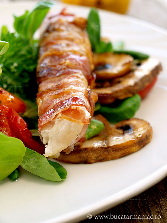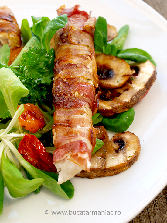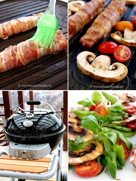 Am taiat fileul pe lungime, in jumatate. Fiecare bucata am invelit-o in felii de pancetta. L-am condimentat cu piper (nu am pus sare aici pentru ca pancetta era sarata). Din ulei, piper si patrunjel tocat marunt am facut un amestec cu care am uns plita si rulourile. Am incins gratarul si implicit plita. Am pus ruloruile pe plita aproximativ 2 minute pe fiecare parte. Alaturi de ruloruri am pus pe gratar si ciupercile felii si rosiile cherry taiate in jumatate. Si pe ele le-am lasat tot cam doua minute pe fiecare parte.