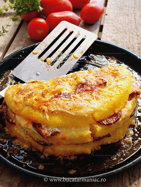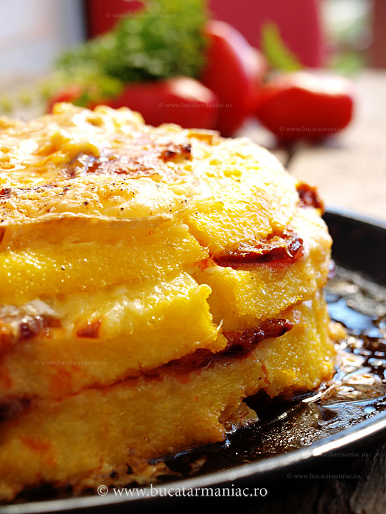 Am rasturnat mamaliga rece intr-o tava, am taiat-o in sectiune asa cum vedeti in imaginea de mai jos, in trei straturi. Am pus peste fiecare strat bucati de branza brie, parmezan ras si felii de carnati. Se poate folosi orice branza sau combinatie de branza. Le-am asezat una peste alta. Deasupra, la fel, am pus de toate. Am bagat mamaliga astfel umpluta la cuptor, la 180 de grade Celsius, pentru 30 de minute. Am servit-o calda, dar este foarte buna si rece.