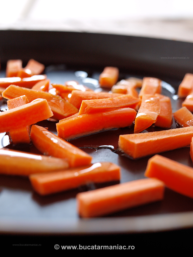 Morcovul si carnea le punem la prajit in putin ulei vegetal pentru 5-6 minute, avand grija sa se gateasca uniform.