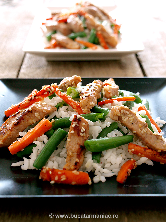 Servim orezul cu fasolea verde deasupra si carnea cu morcovi, toate stropite cu putina zeama de lamaie.