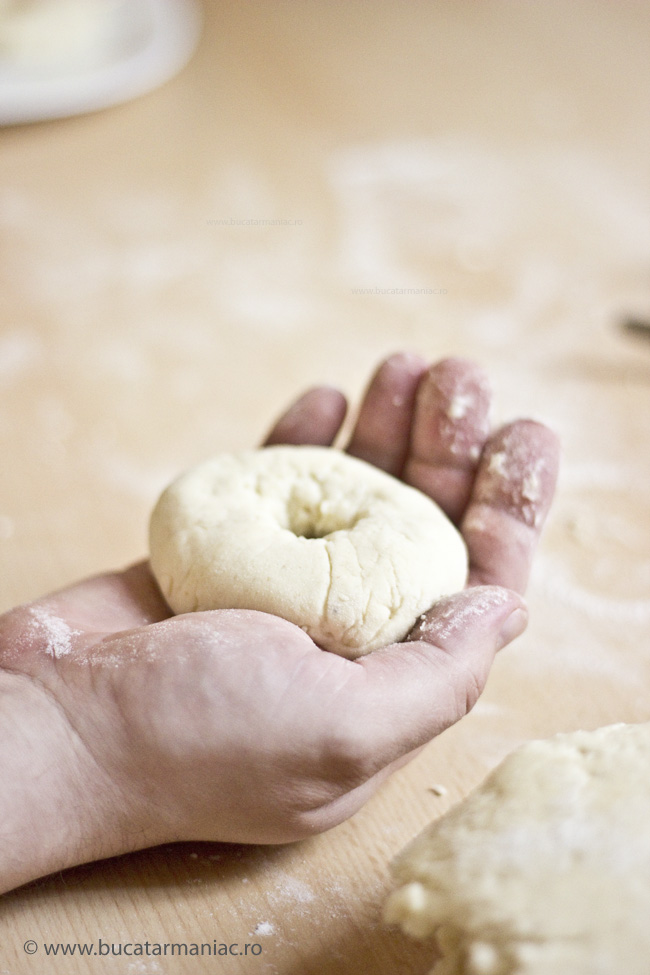 Amestecam branza cu ouale, bicarbonatul de sodiu, sarea, si zaharul, apoi adaugati faina. Branza este bine sa fie bine scursa de zer. daca o cumparati mai moale, este bine sa o lasati la scurs intr-o sita.