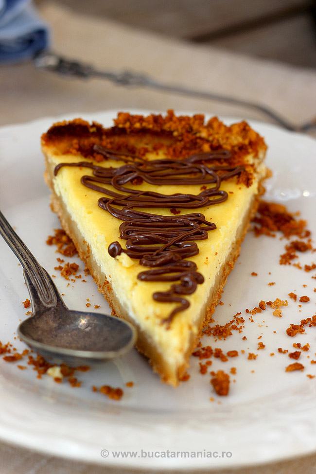 Am amestecat branza cu zaharul vanilat si zahar dupa gust, apoi am adaugat si oul intreg. Omogenizati bine si turnati peste biscuiti. Daca doriti ca cheesecakeul sa iasa mai inalt, dublati cantitatile pentru crema. Introduceti tava la cuptor, acoperita cu o folie de aluminiu, la cea mai mica temperatura posibila (la focul cel mai mic) pentru aprox. o ora. Cuptorul meu e cam naravas la chestii din astea, asa ca am pus o tava dedesubt si in ultimele 10 minute l-am lasat intredeschis.