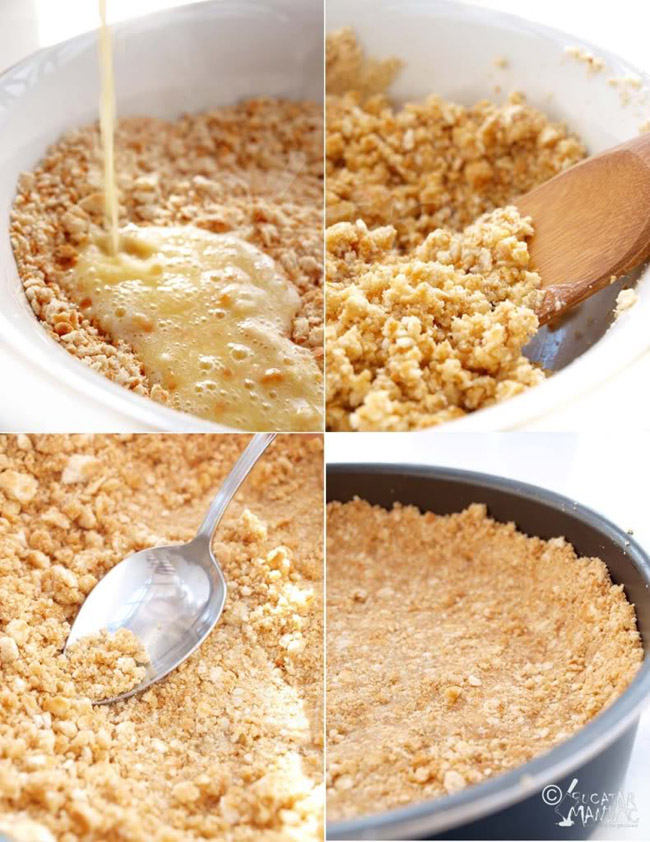 Am topit untul si l-am turnat peste biscuiti (vezi foto de mai jos). Am amestecat bine pana s-au incorporat toate firimiturile. Am turnat amestecul obtinut intr-o tava antiaderenta si l-am presat bine cu o lingura, inclusiv pe margini.