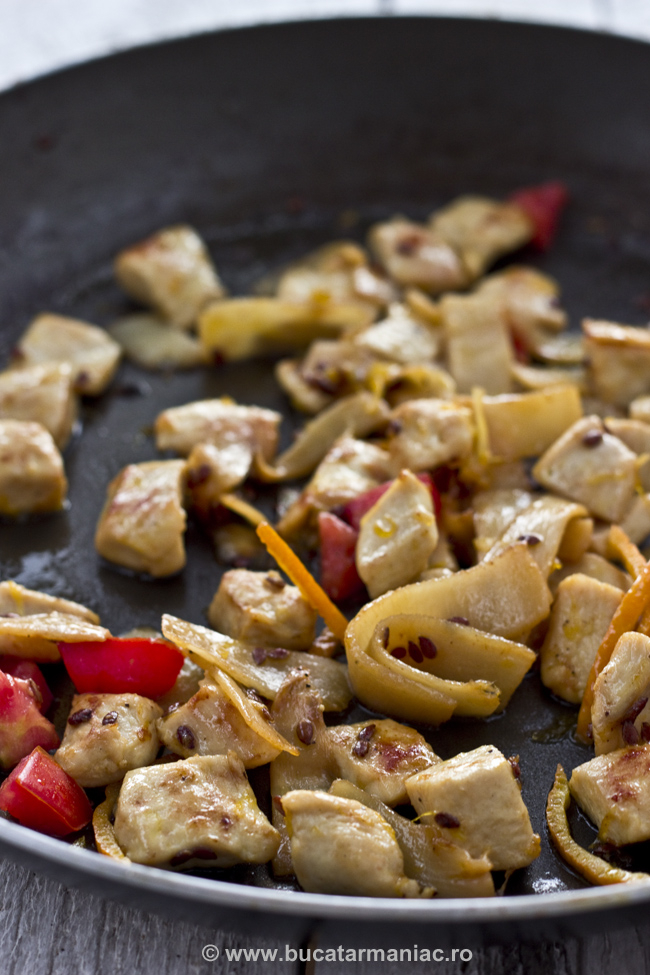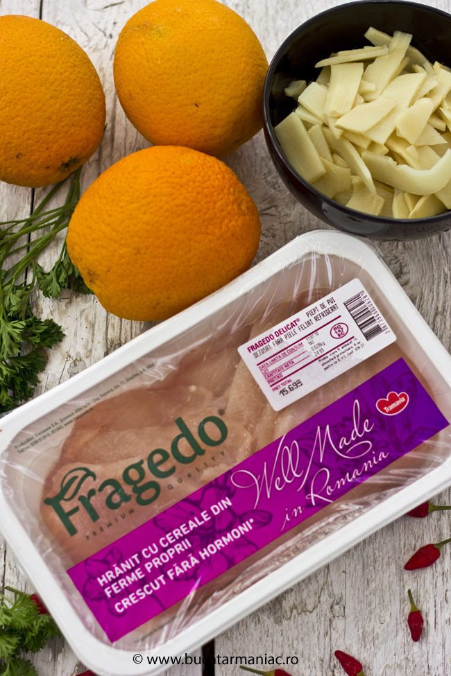 Pieptul de pui cubulete, impreuna cu mugurii de bambus (din borcan), semintele de in si ardeiul gras taiat marunt le-am calit in putin ulei de masline aproximativ 5 minute. Am stins totul cu sucul de la o portocala, apoi am lasat totul pe foc mic sa scada. Am adaugat mierea si vinul, am amestecat usor si am lasat sa fiarba in continuare pana cand lichidul s- a evaporat aproape complet. La final am adaugat putin ardei iute, sare si piper dupa gust. Am umplut cojile de portocale cu puiul astfel gatit si am decorat cu flori de menta, oregano si cimbru (cu masura) si cu frunze de patrunjel proaspat.