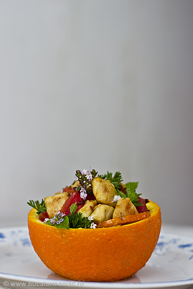 Povestindu-va despre retetele boieresti si minunatiile pe care le-am gasit la Palatul Brukenthal impreuna cu Transavia, mi s-a facut asa o pofta de ceva bun, asa cum am mancat acolo. Adica m-a lovit inspiratia si m-am si apucat de treaba. Am combinat aromele si gusturile pe care le-am intalnit acolo si despre care am auzit povesti si am pregatit niste portocale umplute cu piept de pui, asa cum imi imaginez eu ca trebuie sa fi aratat pe masa lui Brukenthal, la una din fastuasele lui sindrofii.