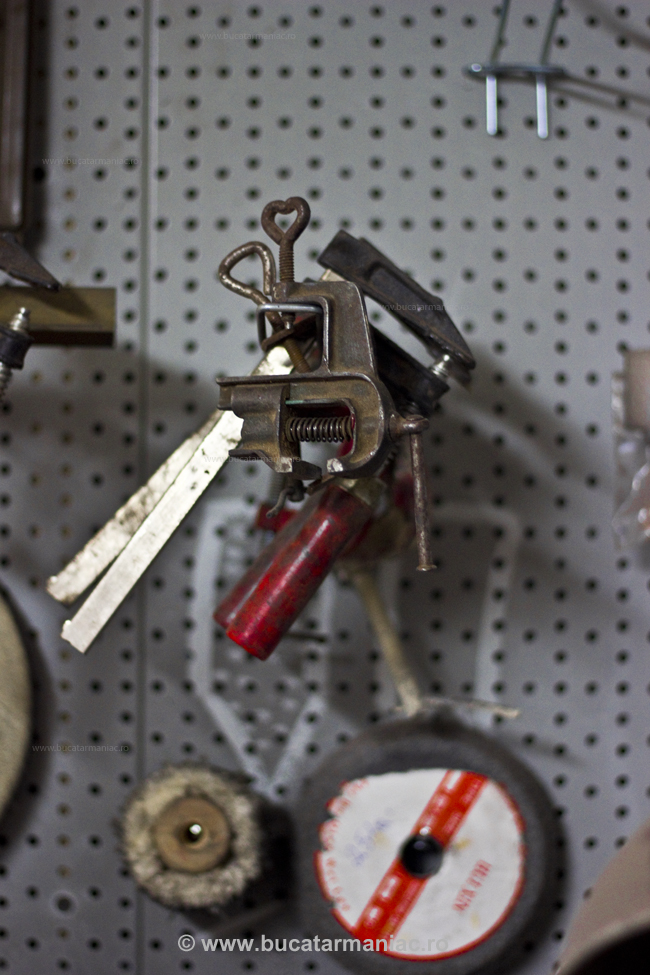 Mi-a povestit putin despre metalele pe care le foloseste la fabricarea cutitelor. Despre cele de bucatarie mi-a spus ca le fabrica din otel AEBL, un otel de proivenienta suedeza, inoxidabil. Le trateaza termic si criogenic pentru a obtine maxim de performanta si durabilitate. Am mai vazut in atelierul lui zeci de cutite unicat, adevarate opere de arta, pe care  ti-e mai mare dragul sa le tii in mana sau chiar si numai sa le privesti. Mi-a spus ca pentru el este foarte important sa stie ce anume doreste cel care il va folosi, ce anume se doreste de la acel cutit, pentru ca posesorul sa fie multumit pe deplin. Acesta este si motivul pentru care ne-am intalnit. I-am povestit si eu depsre ce astept de la un cutit de bucatarie, ce forma si dimensiune prefer si multe alte maruntisuri care la prima vedere pot parea nesemnificative, dar fac diferenta intre un cutit bun si unul perfect. Sper ca aceste detalii il vor ajuta la noua sa linie de cutite de bucatarie.