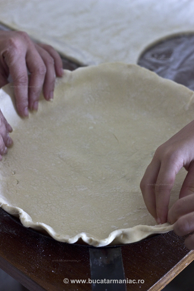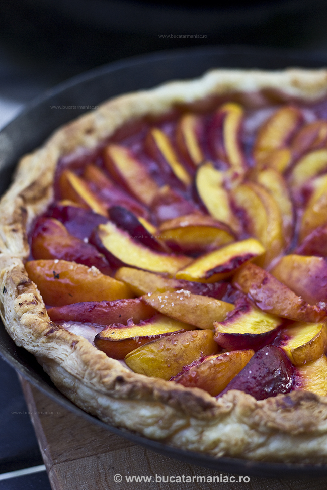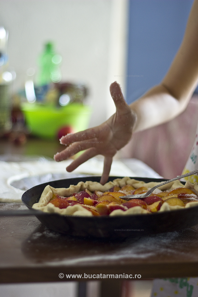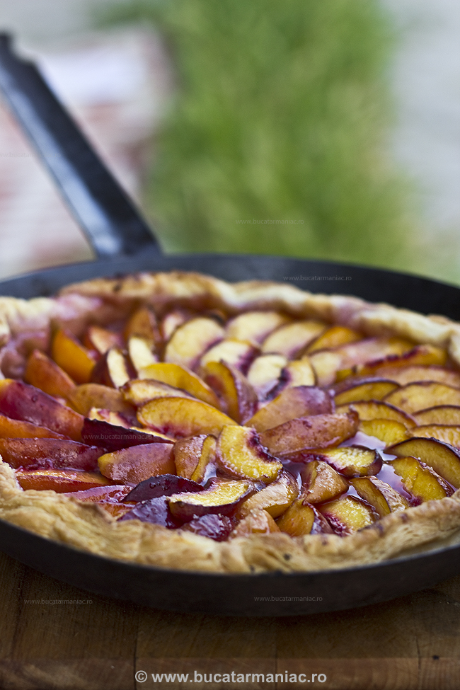 Am pudrat masa cu faina. Am pudrat si aluatul ca sa nu se lipeasca. L-am intins cat s-a putut, adica de aproximativ 4-5 mm grosime si l-am aranjat intr-o tigaie de tabla. Vopi puteti folosi o tava, eu asta am avut la indemana. Am desfacut nectarinele (merge si cu piersici sau caise) si le-am taiat felii. Le-am asezat frumos peste aluat.. Am presarat zahar tos si zahar vanilat peste fructe si putina faina (vreo 2 -3 lingurite), ca sa mai absoarba zeama lasata de ele.