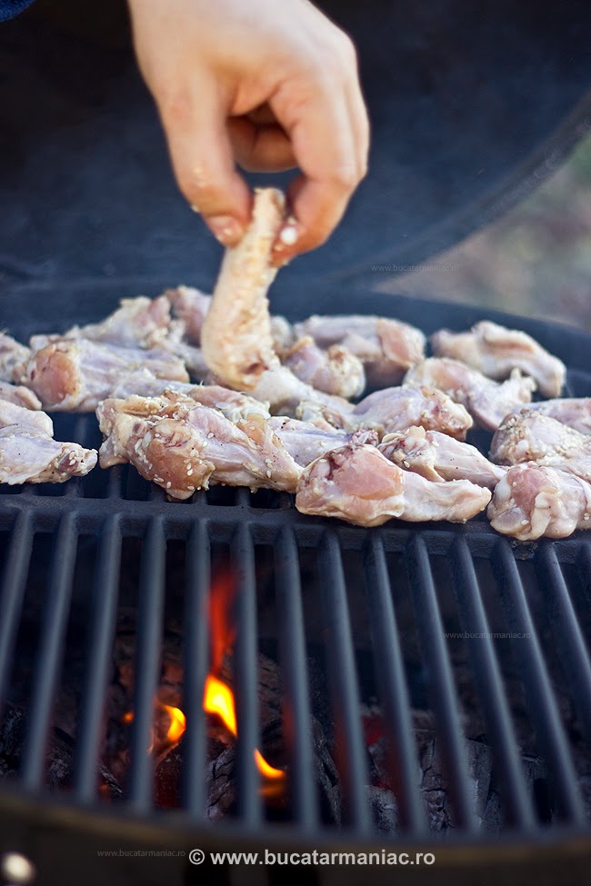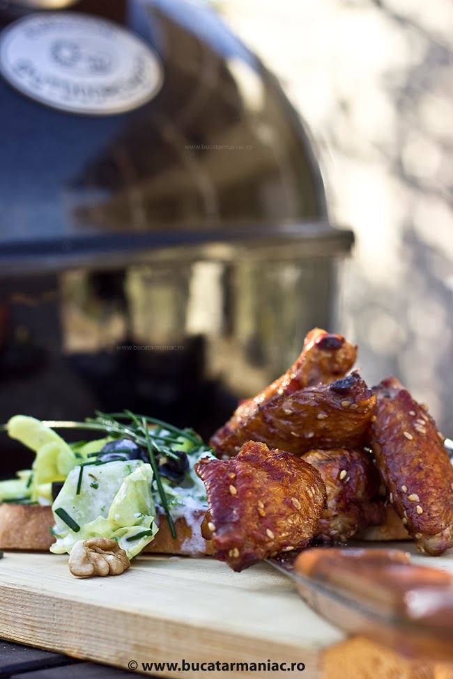 Intr-o zi cu putin soare ne-am furisat spre gradina si am incins carbunii pentru o gustare rapida si delicioasa. Maya, ca de obicei s-a ocupat de o delicioasa salata de cruditati cu iaurt si nuci, iar eu am pregatit inca de acasa niste aripioare de pui in marinada.