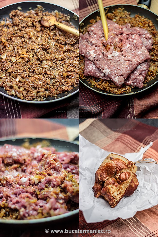 Ceapa se curata, se toaca cat mai marunt si se caleste in putin ulei pana se inmoaie. Se mai adauga: boiaua, piperul, marar proaspat (sau congelat) taiat marunt si orezul. Se calesc inca un minut apoi se amesteca cu carnea.  Se mai poate adauga si cimbru macinat sau maruntit dar, foarte putin pentru ca are ungust foarte puternic. Mie personal imi place sa il adaug sub forma de crenguta printre sarmale. Mararul si cimbrul sunt condimente indispnsabile sarmalelor.
