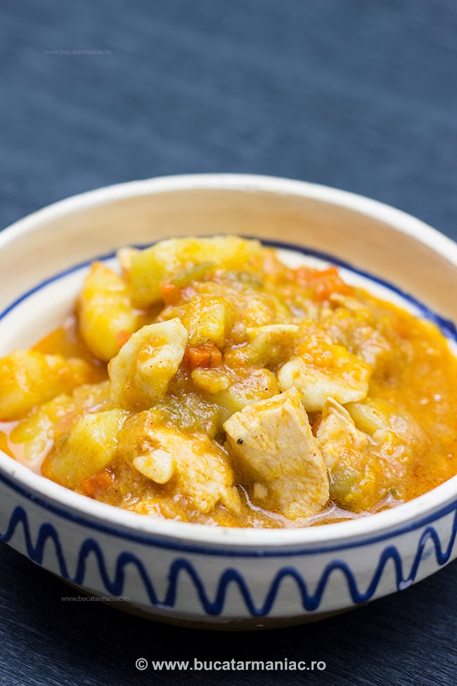 Ceapa morcovul si ardeiul si dovlecelul taiate marunt se calesc in 2-3 linguri de ulei aproximativ 5 minute. Adaugam carnea si cartofii apoi adaugam 2 cani de apa. Condimentam cu sare si piper dupa gust si 2 lingurite de boia dulce si lasam totul sa fiarba la foc mic 20-25 de minute. La final facem un aluat dintr-un ou si faina cu putina sare si facem galuste mici care trebuie sa mai fiarba 3-4 minute. (mai multe despre galustele de faina am scris aici)
