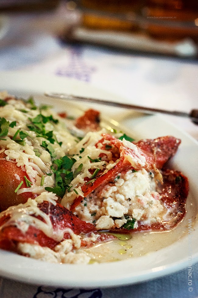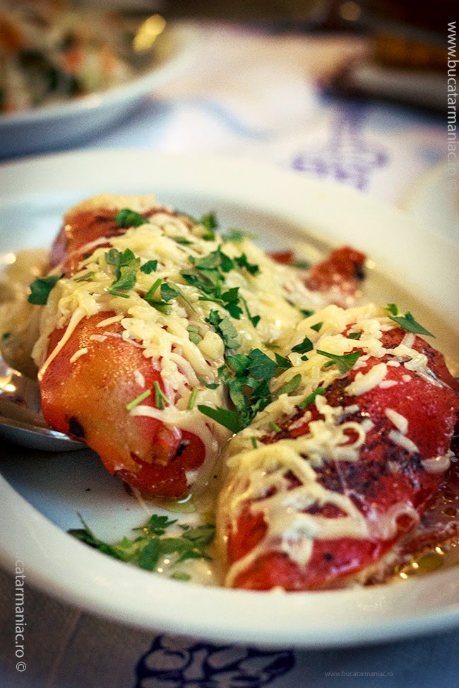Asa cum intuiti, ardeii se coc si se curata de coaja. Alegeti ardei mari si foarte grasi, de preferinta rosii. Indepartati partea cu samburii, fara sa rupeti ardeiul. Umpleti-i cu un amestec de branza dulce si feta (sau telemea sarata). Daca gustul amestecului vi se pare prea intens, putetia dauga si orez fiert. De fapt aici va puteti juca cu diferite amestecuri de branzeturi, care va plac voua, sau puteti folosi doar un singur fel de branza. Ba chiar putetia dauga si legume fierte: morcovi, broccoli etc