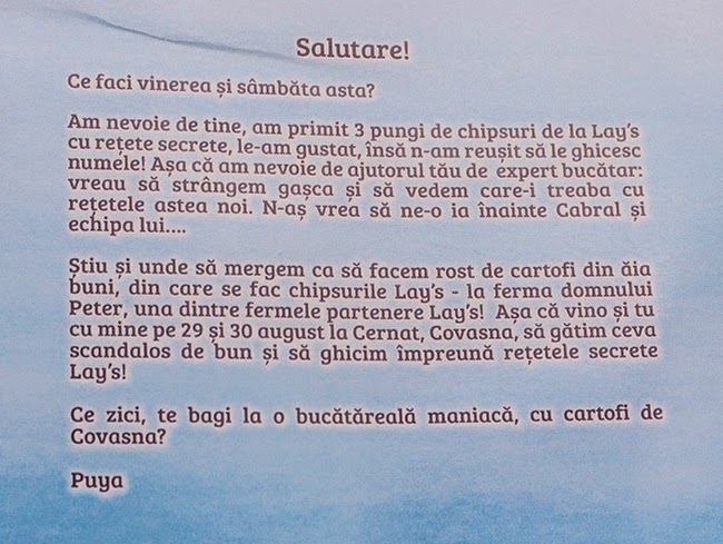 Tocmai am aflat ce o sa fac eu vinerea si sambata asta. Am aflat de la un curier care mi-a adus o invitatie si totodata o provocare care nu poate fi refuzata. Am primit trei pachete cu chipsuri si o scrisoare…de la Puya. Dap. Ati auzit bine. Ma intreaba daca ma bag la o bucatareala maniaca. Pai cum sa nu ma bag daca-i maniaca?? 😀