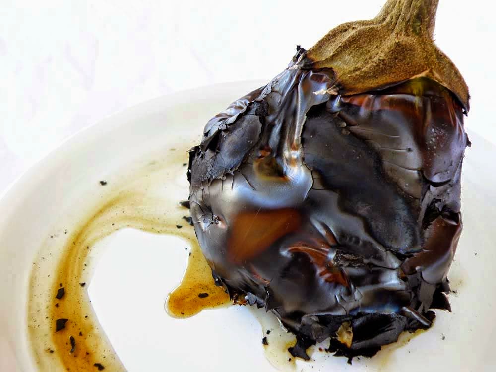 Nu exista o metoda super-usoara de a curata vinetele. Cel mai bine e sa o faceti cum va vine la indemana.  Parerea mea e ca nu trebuie sa ne prajim degetele incercand sa le curatam fierbinti. Pur si simplu nu are nici un rost. nu se curata mai usor daca va opariti. Lasati-le sa se raceasca macar cat sa le puteti atinge. Puteti indeparta coaja cu ajutorul unui cutit, tinand de codita. In acest caz ajutat-va de un vas cu apa si spalati des cutitul. La final puteti spala usor si vanata de eventuale resturi negre.