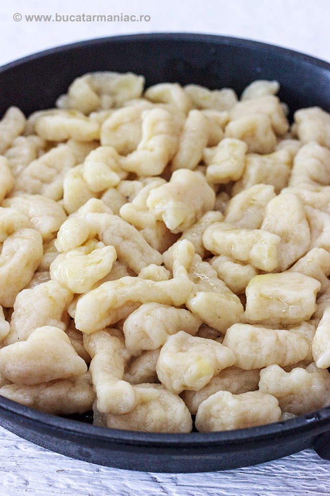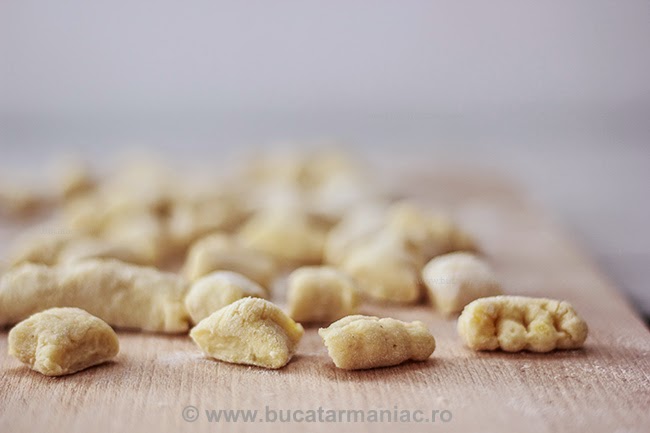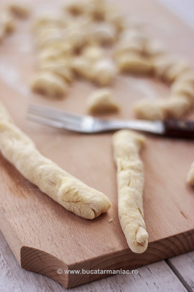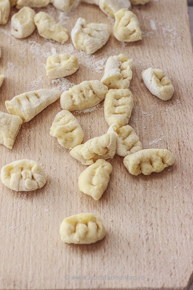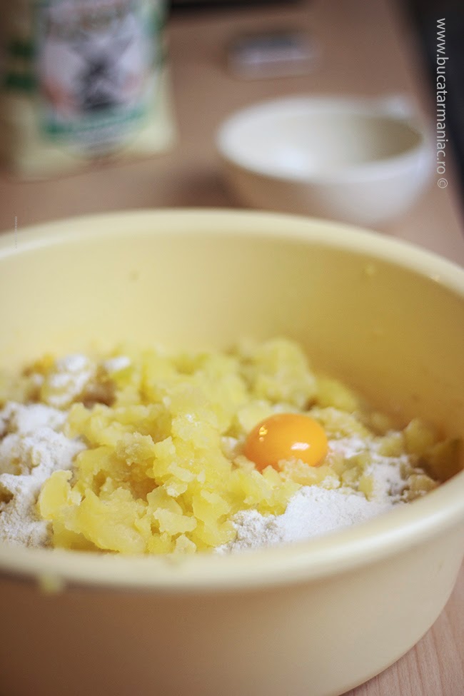 Asadar, cartofii fierti si raciti se zdrobesc bine cu o furculita sau cu telul pentru purée. Nu trebuie sa fie chiar o pasta perfecta. Adaugam ouale si un varf de lingurita de sare si amestecam bine. Apoi adaugam faina treptat, pana obtinem un aluat elastic, usor de modelat care nu se mai lipeste de maini. Aici am explicat ce inseamna faina cat cuprinde