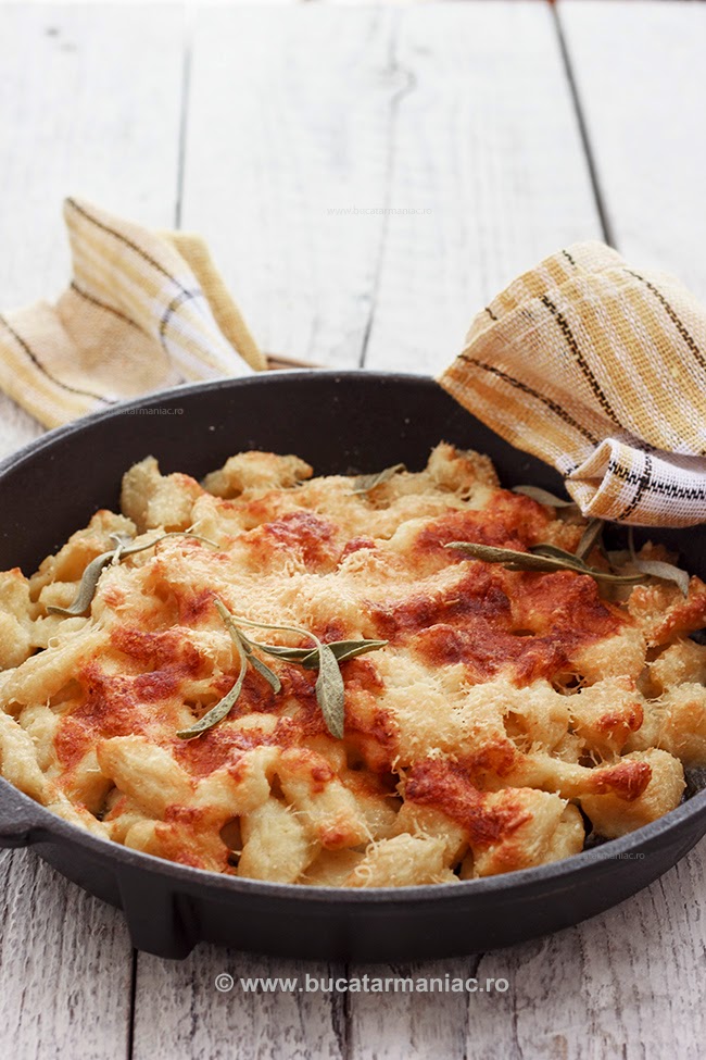 Strecurati galustele, apoi imediat trageti-i intr-o tigaie cu putin unt. Serviti cu orice sos va place (merg perfect sosurile pentru paste). Noi i-am gratinat cu mozzarella, parmezan si salvie la cuptor.