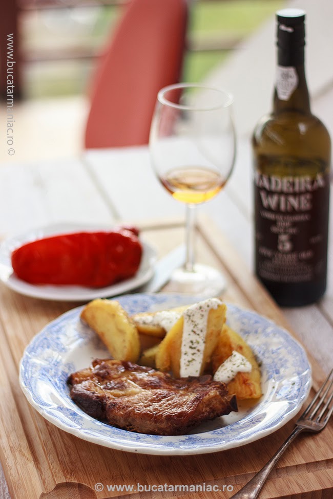 Am avut o sticla de vin (sec) de Madeira, si nu m-am putut abtine sa nu gatesc ceva cu el, pentru ca are o aroma deosebita. S-a nimerit chiar atunci sa am in plan niste ceafa de porc, cu nisste cartofi aurii si un sos alb rapid.