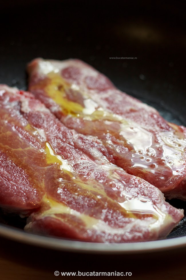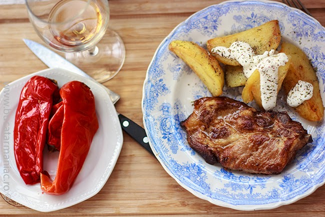 Am prajit carnea pe ambele parti, in putin ulei (2-3 minute pe fiecer parte pana se rumeneste). Am asezonat cu sare si piepr dupa gust, ams tins cu vinul si apoi ampus capacul, lasand ceafa sa se coaca la foc mic aproximativ 40 de minute. Intre timp am pregatit sosul si cartofii aurii. Am servit alaturi de un pahar de vin! Mais implu decat atat si mai delicios nu se poate!