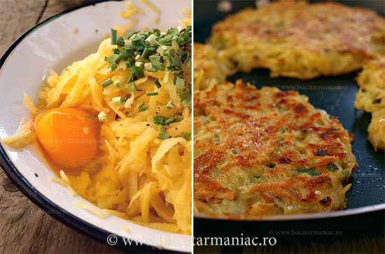 Cartoful si cascavalul se dau pe razatoarea mare si se amesteca cu un ou. Se condimenteaza cu sare, piper si putina ceapa raza sau ceapa verde taiata marunt. Din compozitia obtinuta se formeaza bile pe care le aplatizam bine in palma. Le prajim intr-o tigaie antiaderenta bine incinsa cu putin ulei cateva minute pe fiecare parte, la foc mic, sa se patrunda bine si sa prinda o crusta aurie.