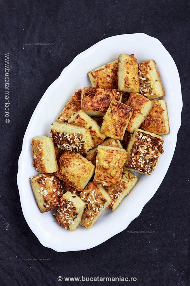 Taiati aluatul in fasii late de 3 cm, pe care apoi le taiati invers, obtinand astfel niste saratele patrate. Asezati-le intr-o tava pe hartie de copt. Nu trebuie distanta mare intre ele, asa ca vor incapea multe in tava.