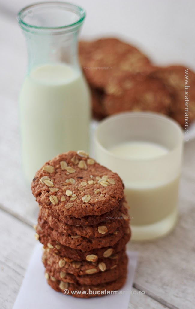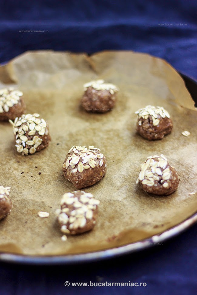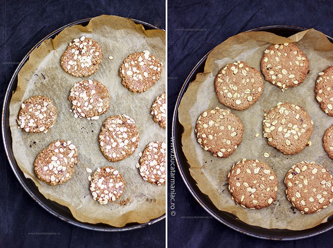 Din aluatul obtinut am facut bilute pe care le-am dat prin fulgi de ovaz si apoi le-am aplatizat cu o lingura, intr-o tava cu hartie de copt.
