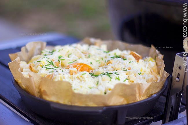 Deasupra turnati restul de sos de smantana, radeti cascaval si presarati cepsoara taiata marunt. Presarati si cateva crutoane (le puteti inlocui cu pesmet), iar in mijoc, spargeti un ou. Presarati putin piper.