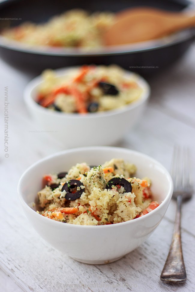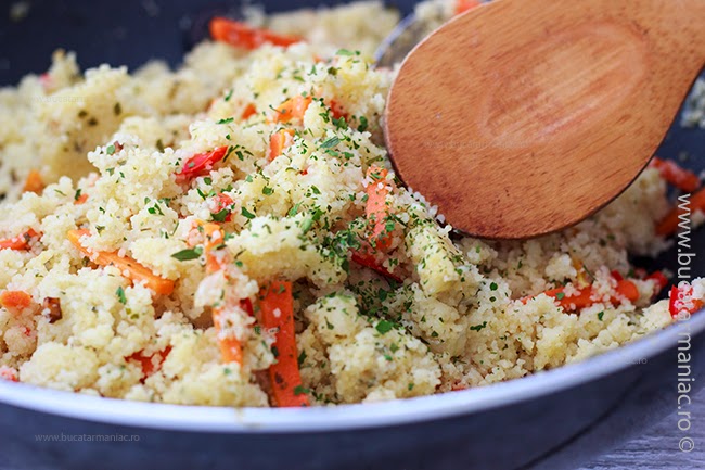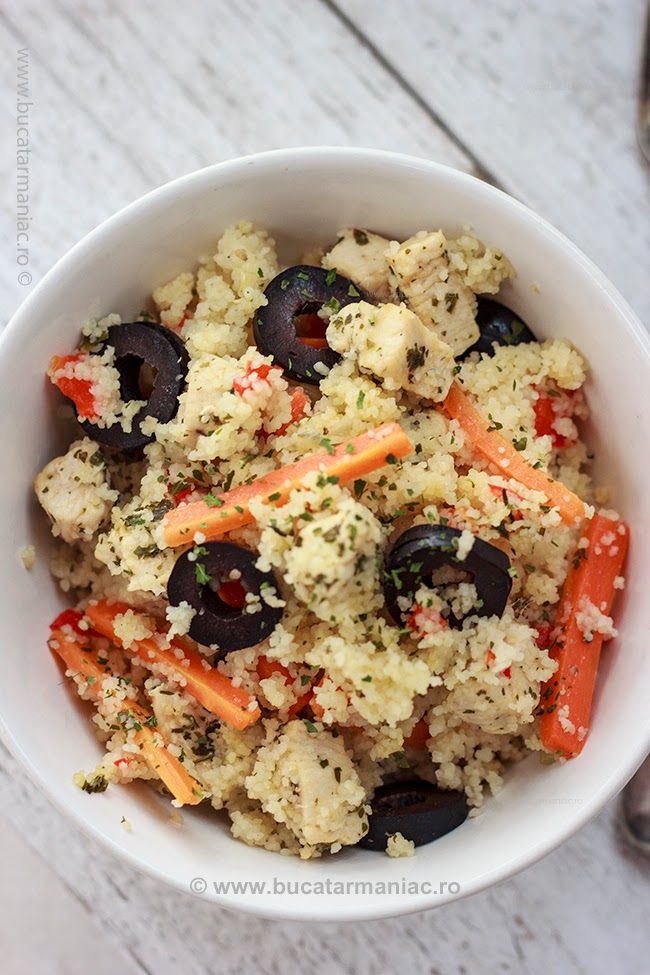 Daca nu mai stiti ce sa gatiti, va propun o reteta rapida de cosucous (sau cuscus), care se pregateste rapid si e foarte gustoasa. Am folosit couscous cu granulatie fina, care nu trebuie fiert, nu din acela din paste fainoase.