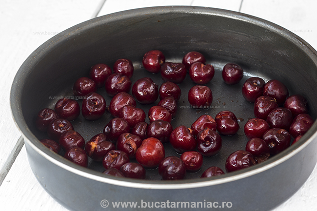 Intr-o tava antiadarenta sau intr-un vas de sticla termorezistent uns cu putin unt (26 cm diametrul tavii mele) asezati ciresele spalate si fara samburi. Restul ingredientelor mixati-le foarte bine, iar apoi turnati compozitia obtinuta deasupra cireselor.