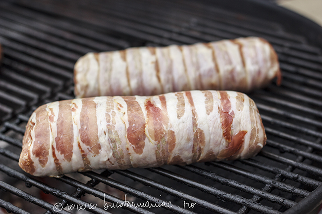 Am preparat un amestec de carne tocata cu usturoi, sare, piper si putin vin  pentru fragezime si aroma. Am impartit compozitia in jumatate si am facut doua rulade. Am impachetat carnea tocata in feliile subtiri de bacon, cu cascavalul in mijloc. Vedeti metoda de impaturare  in fotografiile de mai jos.