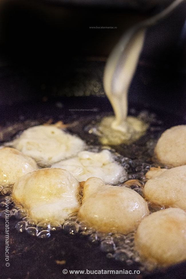 Intr-un castron sau in robotul de bucatarie se mixeaza bine toate ingredientele pana cand se obtine un aluat moale asemanator cu cel de clatite (dar mai gros). Intr-o tigaie se incinge ulei la foc mediu. se pune cate o lingurita de aluat in ueliul incins si se prajeste pe ambele parti. Vom obtine niste gogosi mici si aurii. Se servesc imediat sau sdupa ce se racesc, tavaliti prin zahar praf sau inmuiati in dulceata.