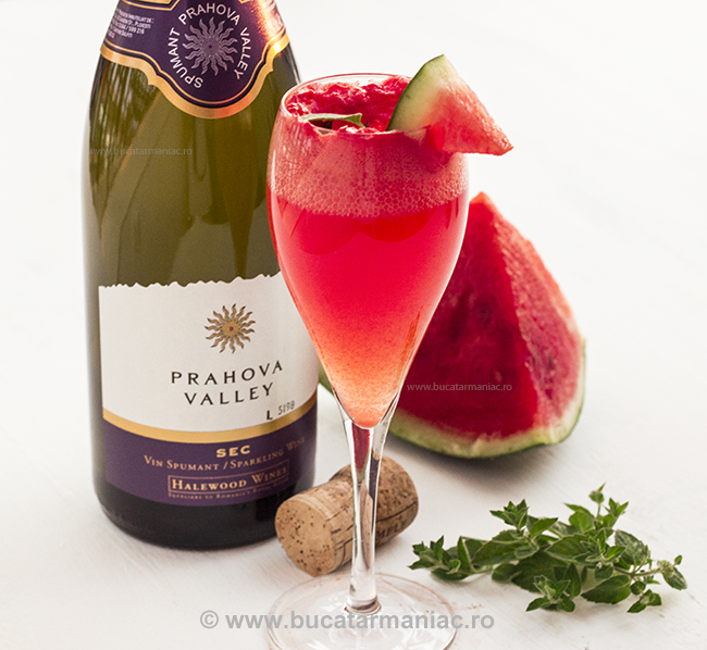 O bucata de pepene rosu fara samburi se da mixeaza in blender si se da prin sita. Umplem aproape jumatate din pahar cu suc de pepene apoi adaugam sucul de portocale si amestecam. Daca e nevoie (daca va place mai dulce) adaugati si sirop de zahar dupa gust. Acest amestec nu trebuie sa depaseasca jumatatea paharului. Completati cu vin spumant Prahova Valley Sec de la Cramele Halewood de la frigider.