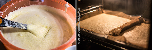 Turnam compozitia intr-o tava cu hartie de copt. Eu am folosit 2 tavi mici de 20×20 cm. Coacem prajitura in cuptorul preincalzit la 160 de grade Celsius pentru aproximativ 25 de minute sau pana cand devine aurie.