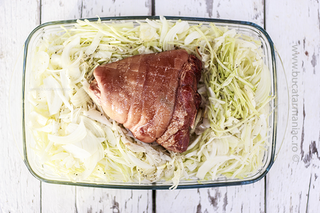 Ciolanul se cresteaza pana la os si se pune peste varza. Se adauga si apa.