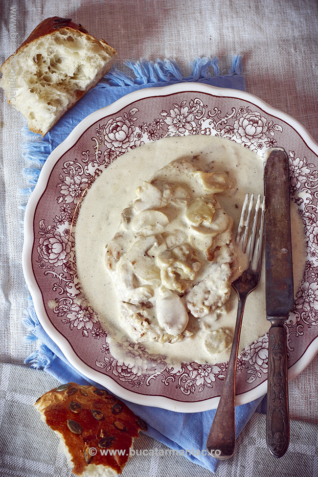 Am batut feliile de cotlet pana au devenit subtiri. Le-am condimentat cu sare, piper. Am pus putin ulei intr-o tigaie adanca si am prajit cotletele 2-3 minute pe fiecare parte. Apoi am adaugat ciupercile si smantana. Am mai lasat sa fiarba totul inca un minut, si gata!