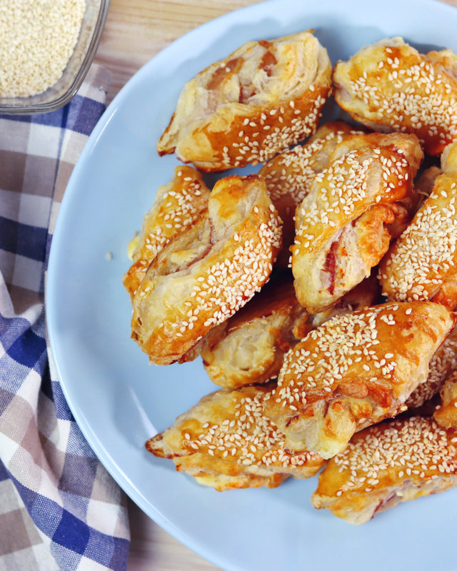 - Am rulat separat fiecare bucată de aluat, tot pe lungime. Am obținut astfel 2 rulouri lungi din aluat cu șuncă și cașcaval, pe care apoi le-am porționat in bucăți mai mici. Am uns fiecare bucată cu ou bătut și deasupra am presărat susan și puțină sare.