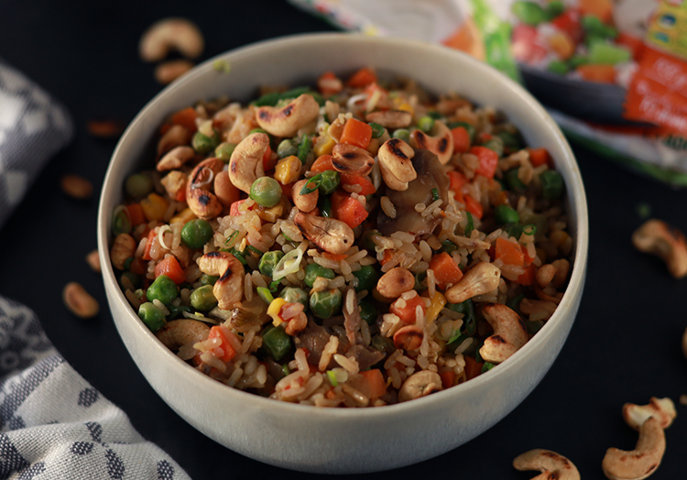 - Am prăjit o mână de caju amestecat cu arahide. Le-am pus peste orezul prăjit. Sunt crocante și merg perfect!
