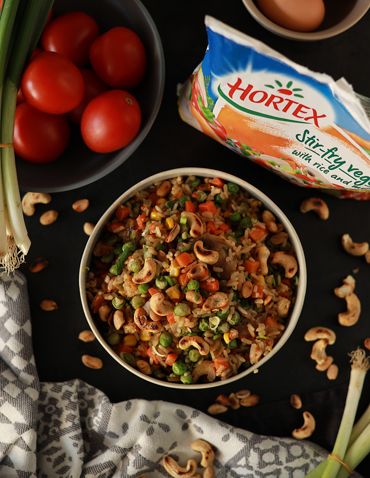 Am descoperit recent legumele stir-fry cu orez și ciuperci de la Hortex, și imediat mi-a venit ideea să le folosesc în această rețetă. Sunt legume proaspete care au fost congelate rapid și se prepară foarte ușor. Am adăugat doar ou, sos de soia, condimente și ceapă verde. Ok, și niște caju și arahide pentru textura crocantă, dar nu sunt obligatorii.