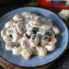 - În final adăugăm câteva frunze proaspete de busuioc și amestecăm totul cu pastele pe care între timp le-am strecurat.