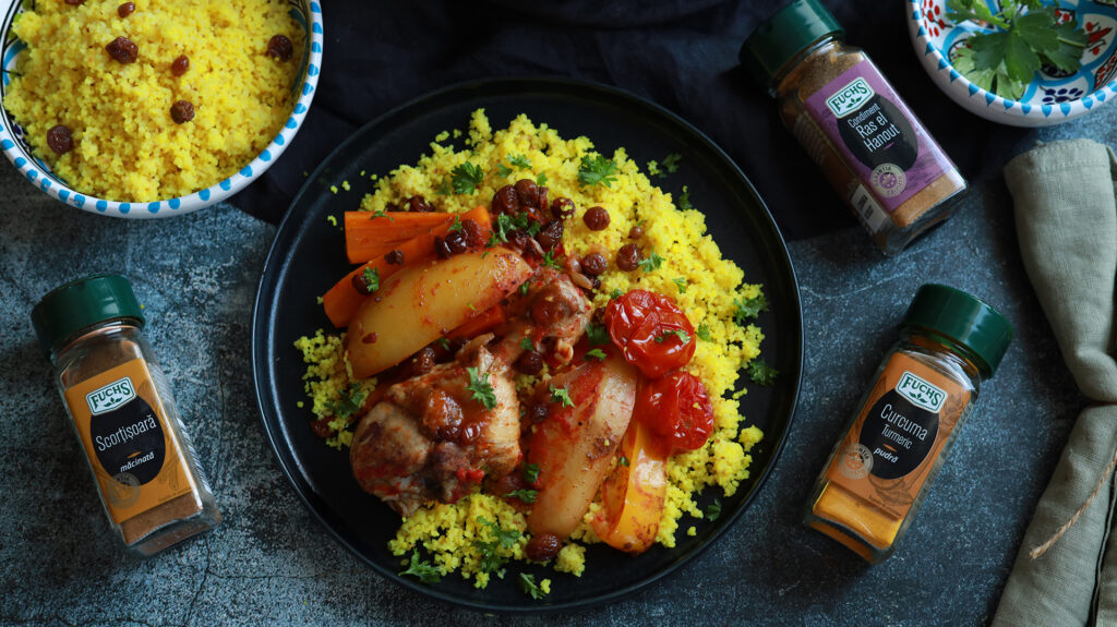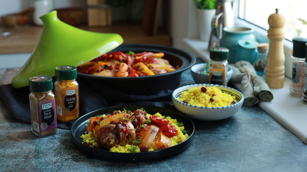 Tajine cu pui, legume și cuscus: rețetă marocană simplă și delicioasă. Află cum să pregătești această mâncare aromată, inspirată de tradiționalul vas de lut. Poți folosi un vas de fontă sau slowcooker. Ingrediente incluse: pulpe de pui, Ras El Hanout , scorțișoară, ceapă, varză, morcovi, cartofi, ardei, roșii cherry, suc de roșii și stafide. Pentru cuscus: cuscus, apă, Curcuma Fuchs și sare.