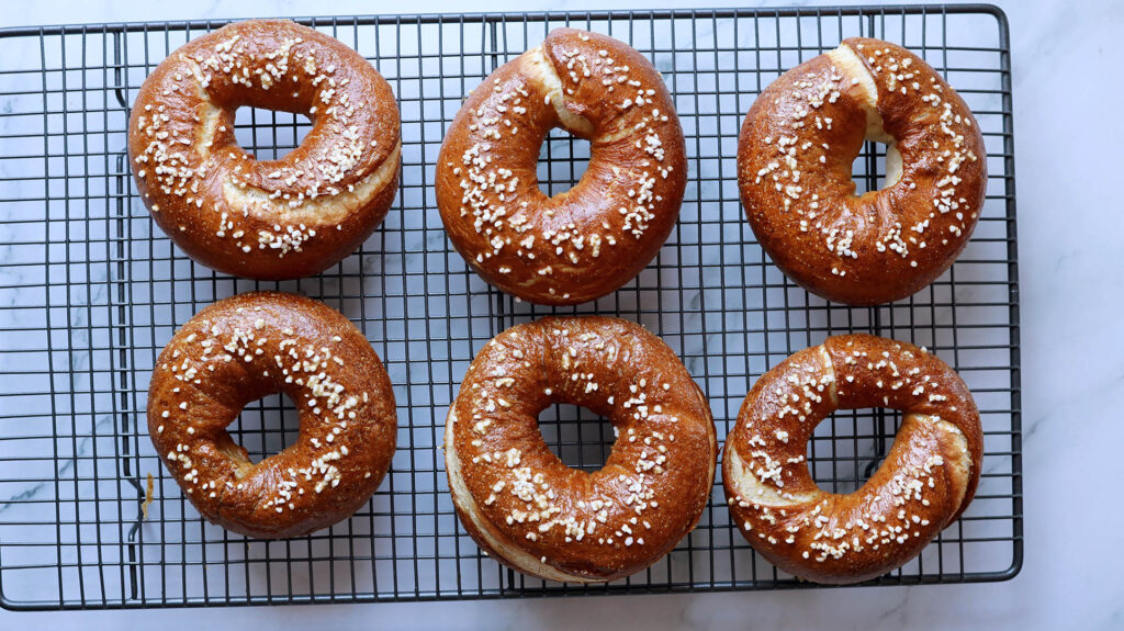 Opărirea aluatului în apă cu bicarbonat este cheia texturii și gustului inconfundabil al pretzel bagels. Această tehnică le oferă o coajă crocantă și un luciu apetisant.