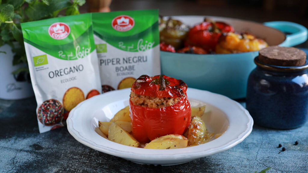 O rețetă tradițională grecească, cu roșii, ardei și dovlecei umpluți cu orez, ierburi și condimente Cosmin Bio.
