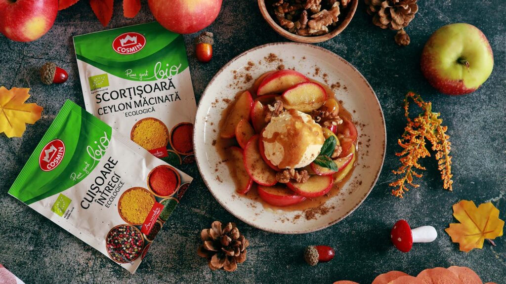 Mere caramelizate cu nuci și înghețată de vanilie – desert rapid de toamnă, aromat cu scorțișoară și cuișoare Cosmin Bio, gata în câteva minute.