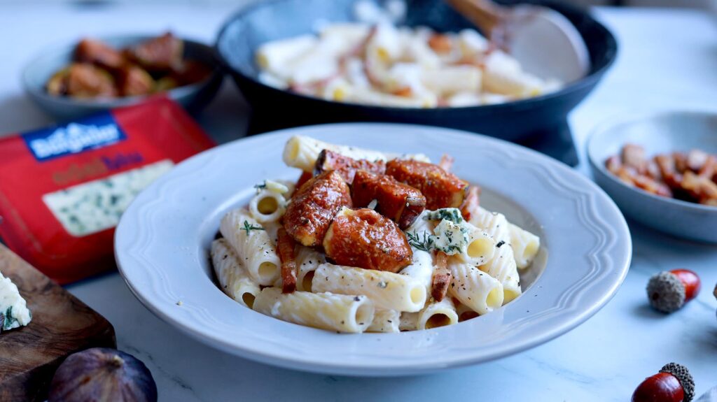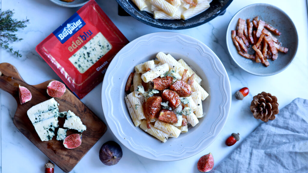 Paste cu smochine caramelizate, pancetta crocantă și sos cremos din Edelblu Bergader – o rețetă rapidă, rafinată și spectaculoasă.